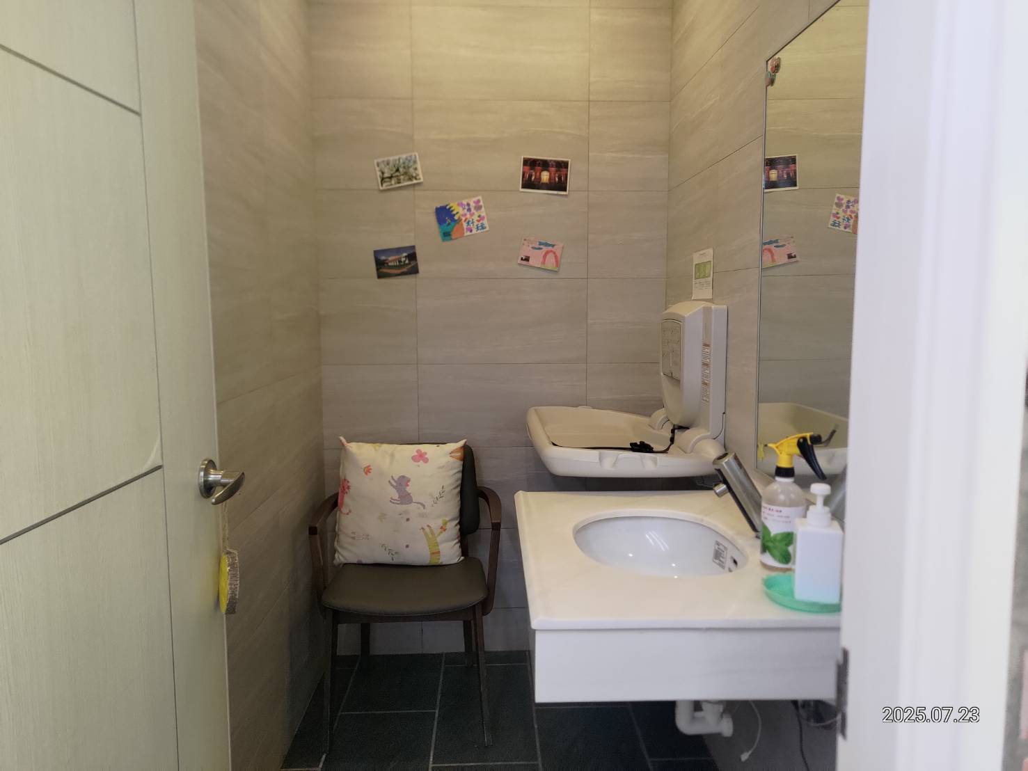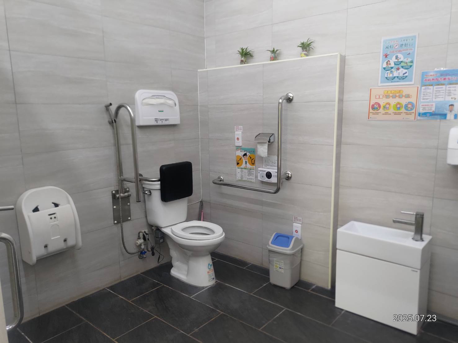 3、無障礙設施,照顧多元需求 公廁內設有無障礙廁間與親子友善設施,體現對不同族群的關懷。無障礙廁間專為身心障礙人士設計,提供了足夠的空間與安全設施,並配有緊急呼叫系統。親子廁所則設有專用的尿布台,讓帶小孩的家庭也能輕鬆使用。