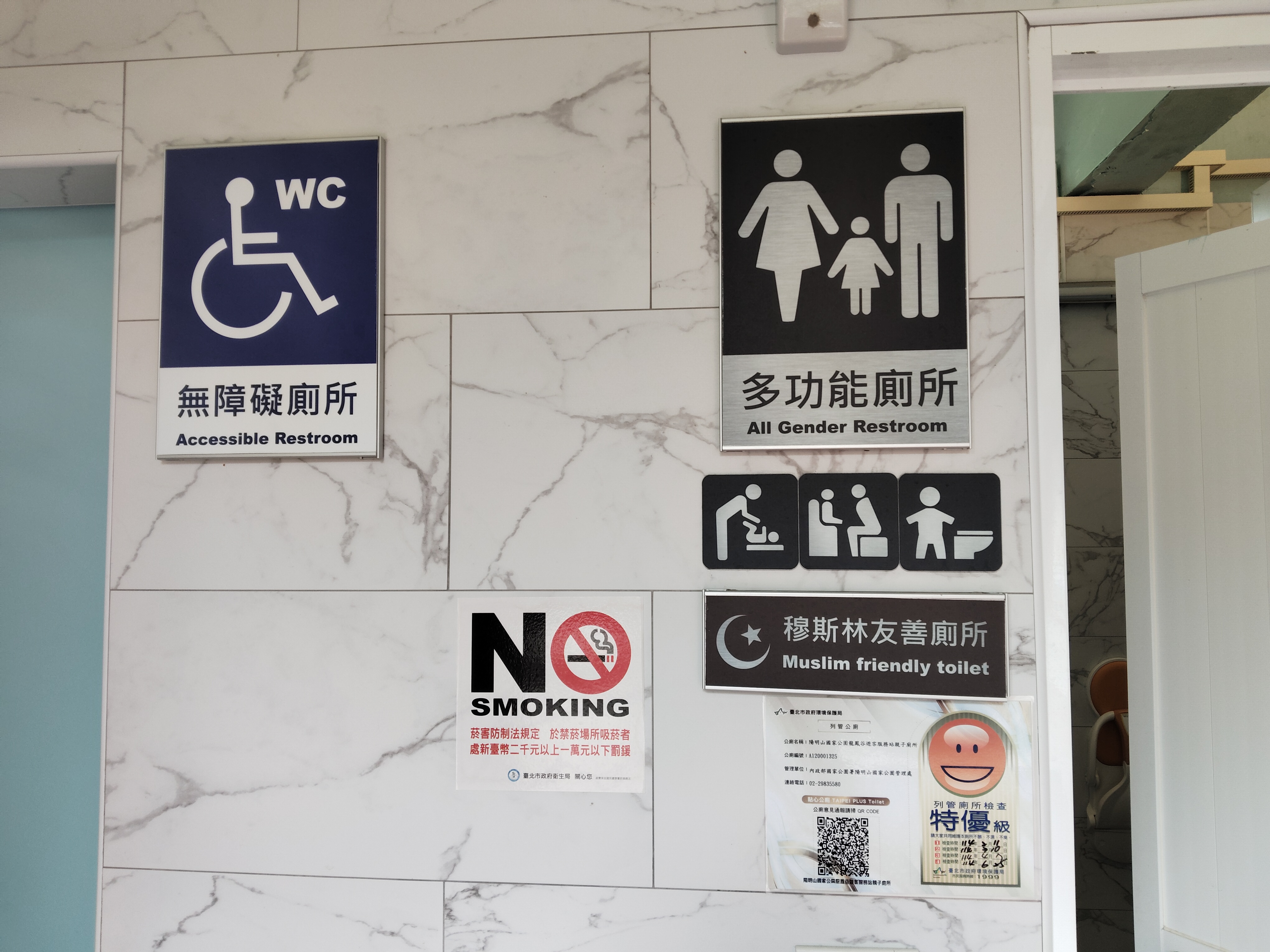3、國際友善:設穆斯林淨下設施、友善穆斯林遊客;採雙語化、圖像化標示,提供國際旅客友善如廁環境。4、環境友善:採用低色溫(3,000K,黃光)燈具降低夜間之光害減少影響環境生態、調節沖水水量、提供可沖衛生紙減少垃圾,避免衝擊環境生態。